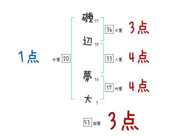 総運![]() | 磯辺夢大さんの総運は53画の3つ星!やや見栄っ張りで虚栄心がある。散財に注意。 あなたの人生を表す1番重要な運勢です。生涯を通じて影響する総合運となり、主に50歳以降の晩年期に影響を及ぼします。 |