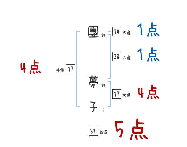 地運![]() | 團夢子さんの地運は17画の4つ星!積極的な行動力。地位を気づき財産を手に入れる。純粋な心と直感力。 個性を表す基礎的な運勢です。性格形成や対人関係、行動力など家庭環境に影響されます。主に誕生してから20歳くらいまでの若年期の運勢を表します。 |
