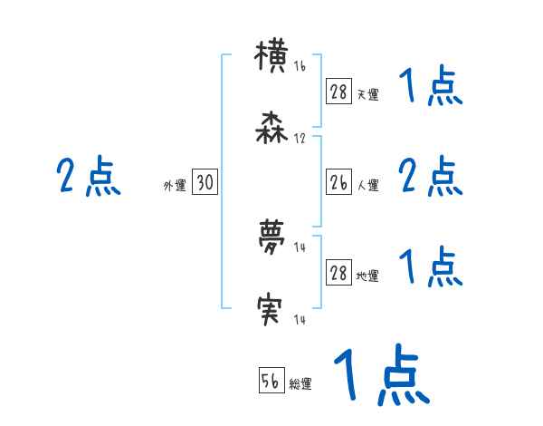天運![]() | 横森夢実さんの天運は28画の1つ星!家庭環境に注意。スポーツで活躍できる能力があるかも。 家系が持つ宿命的な運勢を表します。祖先から受け継いだ苗字ですので自分の力が及びません。家柄を象徴します。 |