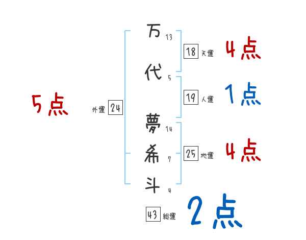外運![]() | 万代夢希斗さんの外運は24画の5つ星!家庭運が良く順調な人生。金運にも恵まれる。 生活面を象徴する運勢です。外部から受ける影響力を表し、結婚運、家庭運や職場、環境への順応性を表します。 |