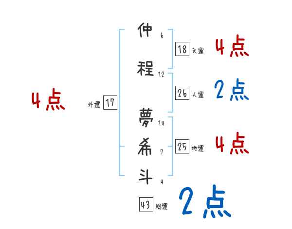 天運![]() | 仲程夢希斗さんの天運は18画の4つ星!情熱的で剛気。忍耐力があり信頼される。 家系が持つ宿命的な運勢を表します。祖先から受け継いだ苗字ですので自分の力が及びません。家柄を象徴します。 |