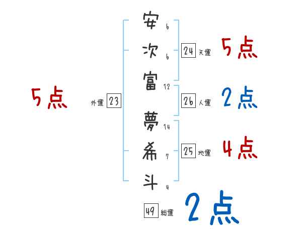 天運![]() | 安次富夢希斗さんの天運は24画の5つ星!家庭運が良く順調な人生。金運にも恵まれる。 家系が持つ宿命的な運勢を表します。祖先から受け継いだ苗字ですので自分の力が及びません。家柄を象徴します。 |