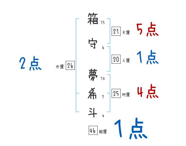 天運![]() | 箱守夢希斗さんの天運は21画の5つ星!統率力がある。独立し成功する。名誉を手に入れる。 家系が持つ宿命的な運勢を表します。祖先から受け継いだ苗字ですので自分の力が及びません。家柄を象徴します。 |
