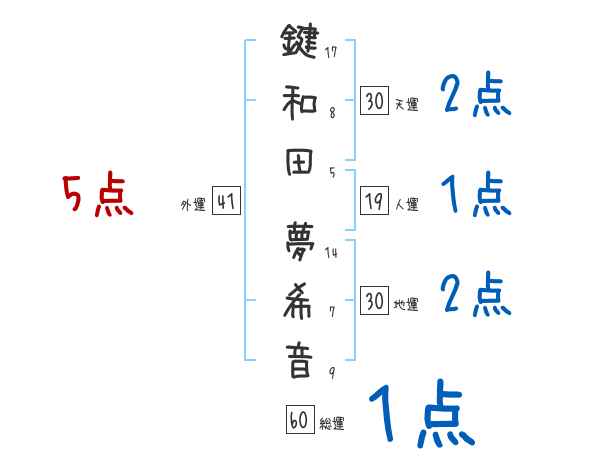 天運![]() | 鍵和田夢希音さんの天運は30画の2つ星!浮き沈みの激しさに注意しましょう。 家系が持つ宿命的な運勢を表します。祖先から受け継いだ苗字ですので自分の力が及びません。家柄を象徴します。 |