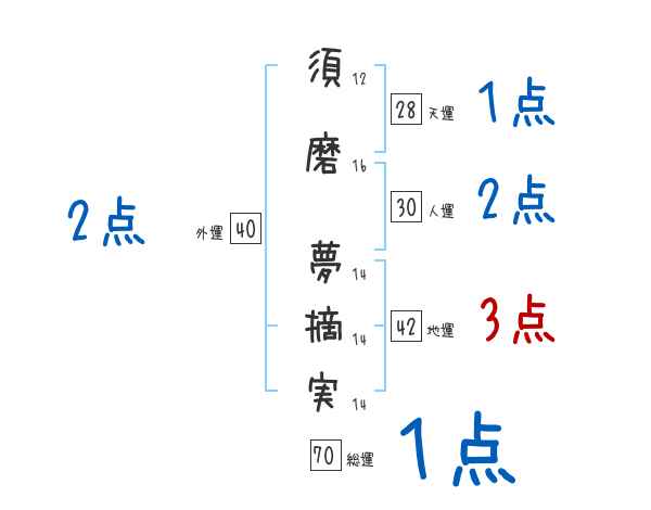 地運![]() | 須磨夢摘実さんの地運は42画の3つ星!病気に注意。多芸であるが消極的でおとなしい。 個性を表す基礎的な運勢です。性格形成や対人関係、行動力など家庭環境に影響されます。主に誕生してから20歳くらいまでの若年期の運勢を表します。 |