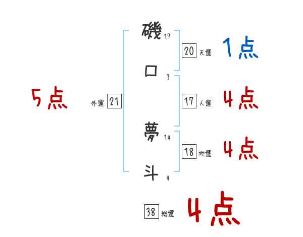 外運![]() | 磯口夢斗さんの外運は21画の5つ星!統率力がある。独立し成功する。名誉を手に入れる。 生活面を象徴する運勢です。外部から受ける影響力を表し、結婚運、家庭運や職場、環境への順応性を表します。 |