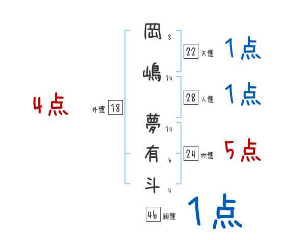 外運![]() | 岡嶋夢有斗さんの外運は18画の4つ星!情熱的で剛気。忍耐力があり信頼される。 生活面を象徴する運勢です。外部から受ける影響力を表し、結婚運、家庭運や職場、環境への順応性を表します。 |