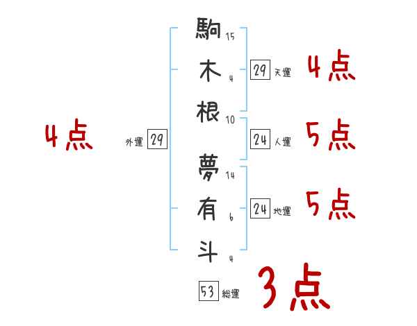 総運![]() | 駒木根夢有斗さんの総運は53画の3つ星!やや見栄っ張りで虚栄心がある。散財に注意。 あなたの人生を表す1番重要な運勢です。生涯を通じて影響する総合運となり、主に50歳以降の晩年期に影響を及ぼします。 |