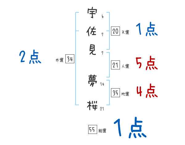 人運![]() | 宇佐見夢桜さんの人運は21画の5つ星!統率力がある。独立し成功する。名誉を手に入れる。 性格や才能などを表す2番目に重要な運勢です。人間関係や協調性、社会的な成功に影響します。主に20歳から50歳ぐらいまでの中年期の運勢を表します。 |