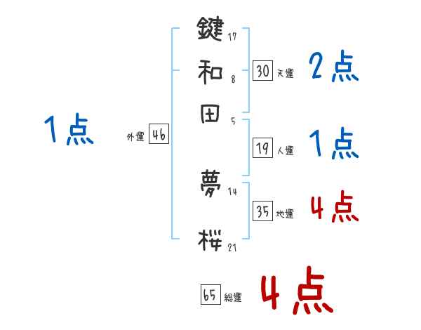 総運![]() | 鍵和田夢桜さんの総運は65画の4つ星!幸運に恵まれ繁栄する。包容力がある。 あなたの人生を表す1番重要な運勢です。生涯を通じて影響する総合運となり、主に50歳以降の晩年期に影響を及ぼします。 |