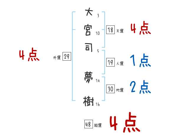 天運![]() | 大宮司夢樹さんの天運は18画の4つ星!情熱的で剛気。忍耐力があり信頼される。 家系が持つ宿命的な運勢を表します。祖先から受け継いだ苗字ですので自分の力が及びません。家柄を象徴します。 |