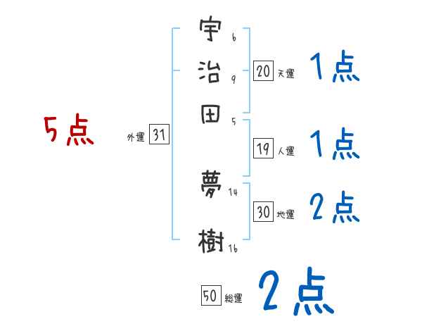 外運![]() | 宇治田夢樹さんの外運は31画の5つ星!社交性があり判断力に優れる。順風満帆な人生で円満な生活。 生活面を象徴する運勢です。外部から受ける影響力を表し、結婚運、家庭運や職場、環境への順応性を表します。 |