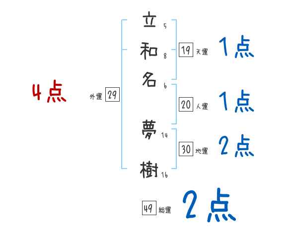 総運![]() | 立和名夢樹さんの総運は49画の2つ星!不安定な性格で明暗がある人生。周りの人には支援されやすい。 あなたの人生を表す1番重要な運勢です。生涯を通じて影響する総合運となり、主に50歳以降の晩年期に影響を及ぼします。 |