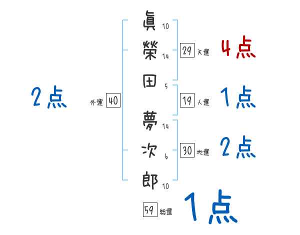天運![]() | 眞榮田夢次郎さんの天運は29画の4つ星!完全主義で才能がある。厳格な心の持ち主。 家系が持つ宿命的な運勢を表します。祖先から受け継いだ苗字ですので自分の力が及びません。家柄を象徴します。 |
