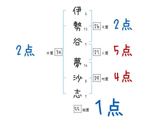 外運![]() | 伊勢谷夢沙志さんの外運は34画の2つ星!独創性に優れるが、自尊心が強く災難に注意しましょう。 生活面を象徴する運勢です。外部から受ける影響力を表し、結婚運、家庭運や職場、環境への順応性を表します。 |
