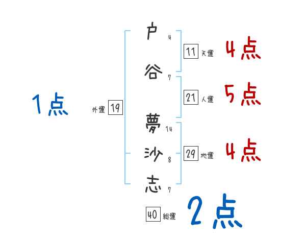 天運![]() | 戸谷夢沙志さんの天運は11画の4つ星!着実に富や地位を得る幸運な人生。 家系が持つ宿命的な運勢を表します。祖先から受け継いだ苗字ですので自分の力が及びません。家柄を象徴します。 |