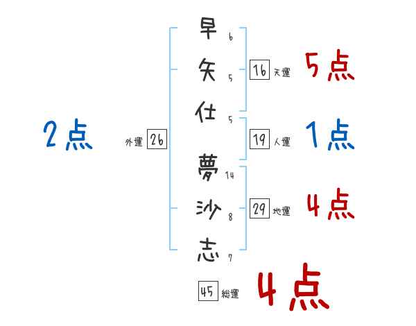 総運![]() | 早矢仕夢沙志さんの総運は45画の4つ星!もくもくと物事を進め達成する。地味な努力家。 あなたの人生を表す1番重要な運勢です。生涯を通じて影響する総合運となり、主に50歳以降の晩年期に影響を及ぼします。 |