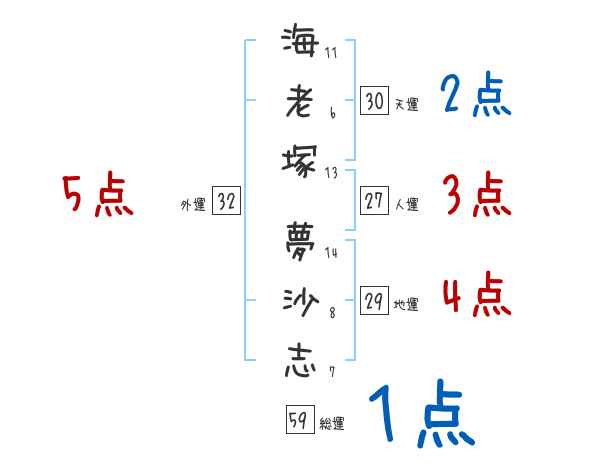 外運![]() | 海老塚夢沙志さんの外運は32画の5つ星!柔軟性があり成功する。チャンスが多く金運が良い。 生活面を象徴する運勢です。外部から受ける影響力を表し、結婚運、家庭運や職場、環境への順応性を表します。 |