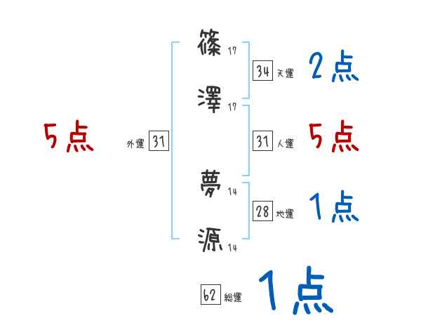 天運![]() | 篠澤夢源さんの天運は34画の2つ星!独創性に優れるが、自尊心が強く災難に注意しましょう。 家系が持つ宿命的な運勢を表します。祖先から受け継いだ苗字ですので自分の力が及びません。家柄を象徴します。 |