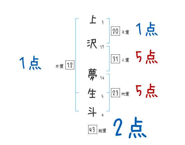 総運![]() | 上沢夢生斗さんの総運は43画の2つ星!頑固な性格で独立心が強いかも。やや非現実的で浪費に注意しましょう。 あなたの人生を表す1番重要な運勢です。生涯を通じて影響する総合運となり、主に50歳以降の晩年期に影響を及ぼします。 |