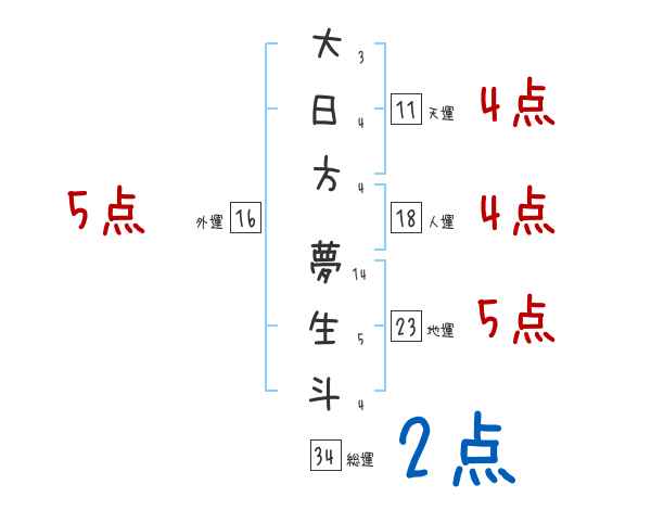 外運![]() | 大日方夢生斗さんの外運は16画の5つ星!人望が厚く大きく発展する。逆転成功が見える。 生活面を象徴する運勢です。外部から受ける影響力を表し、結婚運、家庭運や職場、環境への順応性を表します。 |