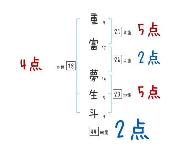 天運![]() | 重富夢生斗さんの天運は21画の5つ星!統率力がある。独立し成功する。名誉を手に入れる。 家系が持つ宿命的な運勢を表します。祖先から受け継いだ苗字ですので自分の力が及びません。家柄を象徴します。 |