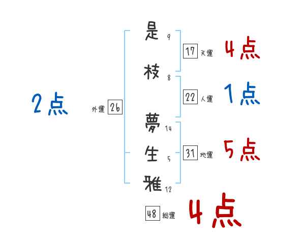 天運![]() | 是枝夢生雅さんの天運は17画の4つ星!積極的な行動力。地位を気づき財産を手に入れる。純粋な心と直感力。 家系が持つ宿命的な運勢を表します。祖先から受け継いだ苗字ですので自分の力が及びません。家柄を象徴します。 |