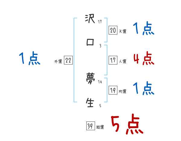 総運![]() | 沢口夢生さんの総運は39画の5つ星!社交性に優れ人望が厚い。人の上に立ち成功する。 あなたの人生を表す1番重要な運勢です。生涯を通じて影響する総合運となり、主に50歳以降の晩年期に影響を及ぼします。 |
