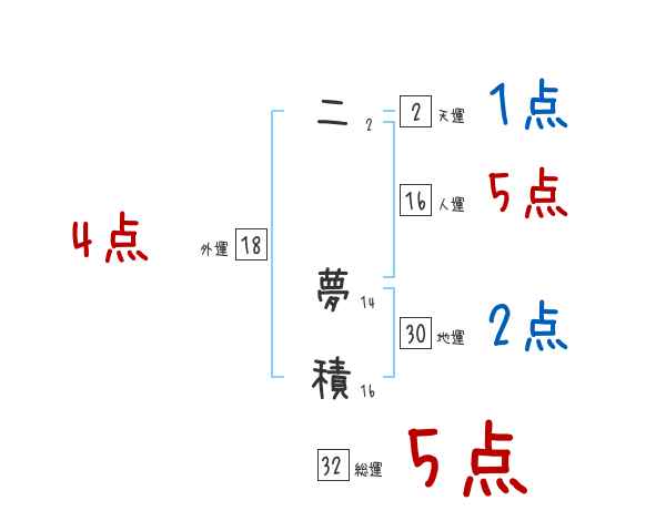 総運![]() | 二夢積さんの総運は32画の5つ星!柔軟性があり成功する。チャンスが多く金運が良い。 あなたの人生を表す1番重要な運勢です。生涯を通じて影響する総合運となり、主に50歳以降の晩年期に影響を及ぼします。 |
