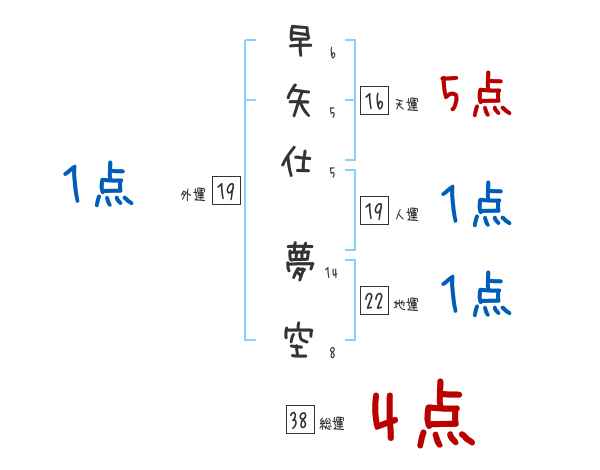 外運![]() | 早矢仕夢空さんの外運は19画の1つ星!優れた才能を持ちますが、協調性が足りないことも。周りの人と協力する事を意識しましょう。 生活面を象徴する運勢です。外部から受ける影響力を表し、結婚運、家庭運や職場、環境への順応性を表します。 |