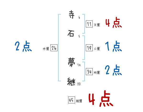 外運![]() | 寺石夢継さんの外運は26画の2つ星!波瀾万丈かも。信頼できる人を大事にしましょう。 生活面を象徴する運勢です。外部から受ける影響力を表し、結婚運、家庭運や職場、環境への順応性を表します。 |
