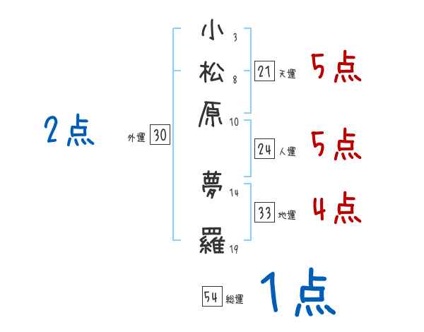 総運![]() | 小松原夢羅さんの総運は54画の1つ星!トラブルが多いかも。周りをよく見て協調して過ごしましょう。 あなたの人生を表す1番重要な運勢です。生涯を通じて影響する総合運となり、主に50歳以降の晩年期に影響を及ぼします。 |