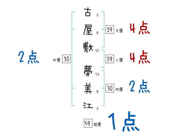 天運![]() | 古屋敷夢美江さんの天運は29画の4つ星!完全主義で才能がある。厳格な心の持ち主。 家系が持つ宿命的な運勢を表します。祖先から受け継いだ苗字ですので自分の力が及びません。家柄を象徴します。 |