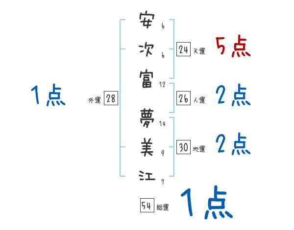 天運![]() | 安次富夢美江さんの天運は24画の5つ星!家庭運が良く順調な人生。金運にも恵まれる。 家系が持つ宿命的な運勢を表します。祖先から受け継いだ苗字ですので自分の力が及びません。家柄を象徴します。 |