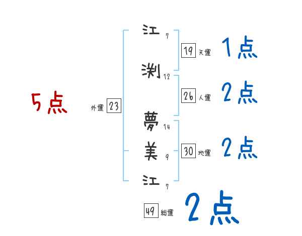 地運![]() | 江渕夢美江さんの地運は30画の2つ星!浮き沈みの激しさに注意しましょう。 個性を表す基礎的な運勢です。性格形成や対人関係、行動力など家庭環境に影響されます。主に誕生してから20歳くらいまでの若年期の運勢を表します。 |