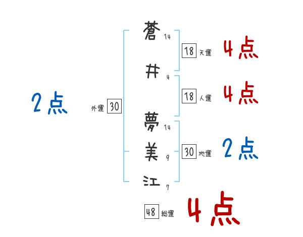 外運![]() | 蒼井夢美江さんの外運は30画の2つ星!浮き沈みの激しさに注意しましょう。 生活面を象徴する運勢です。外部から受ける影響力を表し、結婚運、家庭運や職場、環境への順応性を表します。 |