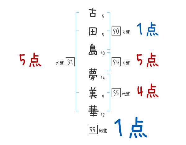 人運![]() | 古田島夢美華さんの人運は24画の5つ星!家庭運が良く順調な人生。金運にも恵まれる。 性格や才能などを表す2番目に重要な運勢です。人間関係や協調性、社会的な成功に影響します。主に20歳から50歳ぐらいまでの中年期の運勢を表します。 |