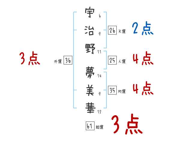 天運![]() | 宇治野夢美華さんの天運は26画の2つ星!波瀾万丈かも。信頼できる人を大事にしましょう。 家系が持つ宿命的な運勢を表します。祖先から受け継いだ苗字ですので自分の力が及びません。家柄を象徴します。 |