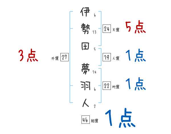 天運![]() | 伊勢田夢羽人さんの天運は24画の5つ星!家庭運が良く順調な人生。金運にも恵まれる。 家系が持つ宿命的な運勢を表します。祖先から受け継いだ苗字ですので自分の力が及びません。家柄を象徴します。 |