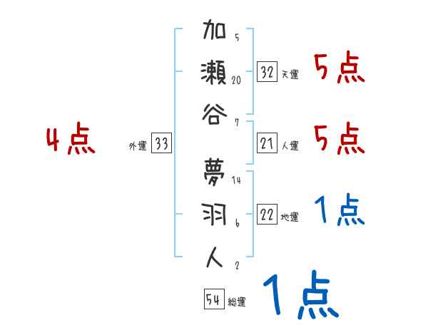 天運![]() | 加瀬谷夢羽人さんの天運は32画の5つ星!柔軟性があり成功する。チャンスが多く金運が良い。 家系が持つ宿命的な運勢を表します。祖先から受け継いだ苗字ですので自分の力が及びません。家柄を象徴します。 |