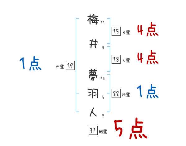 外運![]() | 梅井夢羽人さんの外運は19画の1つ星!優れた才能を持ちますが、協調性が足りないことも。周りの人と協力する事を意識しましょう。 生活面を象徴する運勢です。外部から受ける影響力を表し、結婚運、家庭運や職場、環境への順応性を表します。 |