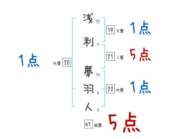 天運![]()  | 浅利夢羽人さんの天運は19画の1つ星!優れた才能を持ちますが、協調性が足りないことも。周りの人と協力する事を意識しましょう。 家系が持つ宿命的な運勢を表します。祖先から受け継いだ苗字ですので自分の力が及びません。家柄を象徴します。 |
