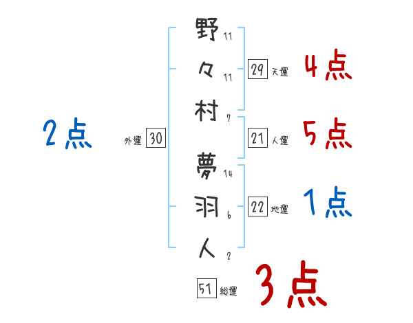 総運![]() | 野々村夢羽人さんの総運は51画の3つ星!変化が激しく、危険に注意。堅実な性格。 あなたの人生を表す1番重要な運勢です。生涯を通じて影響する総合運となり、主に50歳以降の晩年期に影響を及ぼします。 |
