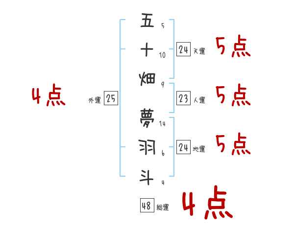 天運![]() | 五十畑夢羽斗さんの天運は24画の5つ星!家庭運が良く順調な人生。金運にも恵まれる。 家系が持つ宿命的な運勢を表します。祖先から受け継いだ苗字ですので自分の力が及びません。家柄を象徴します。 |