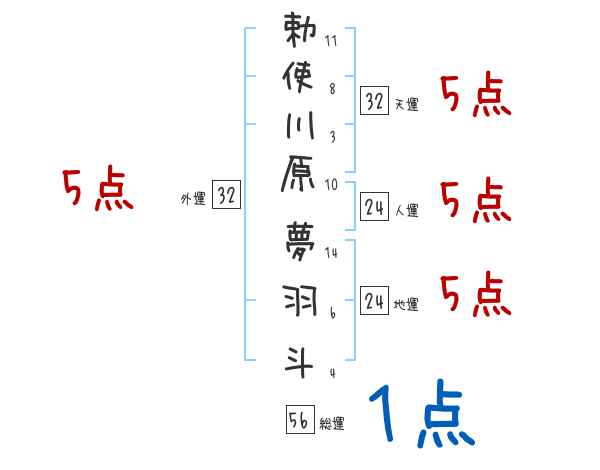 天運![]() | 勅使川原夢羽斗さんの天運は32画の5つ星!柔軟性があり成功する。チャンスが多く金運が良い。 家系が持つ宿命的な運勢を表します。祖先から受け継いだ苗字ですので自分の力が及びません。家柄を象徴します。 |