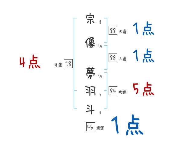 | 外運  | 宗像夢羽斗さんの外運は18画の4つ星!情熱的で剛気。忍耐力があり信頼される。生活面を象徴する運勢です。外部から受ける影響力を表し、結婚運、家庭運や職場、環境への順応性を表します。 |