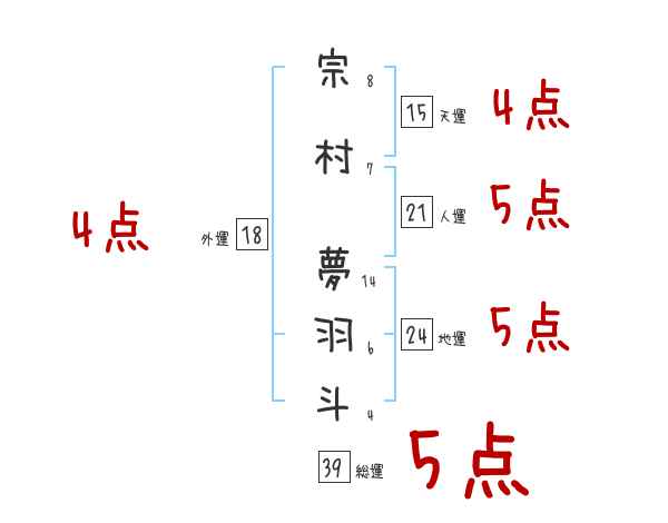 総運![]() | 宗村夢羽斗さんの総運は39画の5つ星!社交性に優れ人望が厚い。人の上に立ち成功する。 あなたの人生を表す1番重要な運勢です。生涯を通じて影響する総合運となり、主に50歳以降の晩年期に影響を及ぼします。 |
