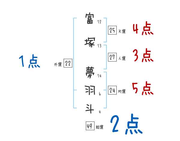 天運![]() | 富塚夢羽斗さんの天運は25画の4つ星!個性があり才能があふれる。強運の持ち主で発展する。 家系が持つ宿命的な運勢を表します。祖先から受け継いだ苗字ですので自分の力が及びません。家柄を象徴します。 |