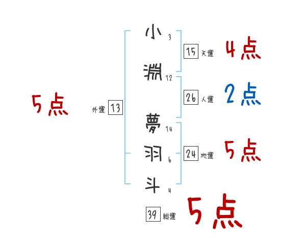 総運![]() | 小淵夢羽斗さんの総運は39画の5つ星!社交性に優れ人望が厚い。人の上に立ち成功する。 あなたの人生を表す1番重要な運勢です。生涯を通じて影響する総合運となり、主に50歳以降の晩年期に影響を及ぼします。 |