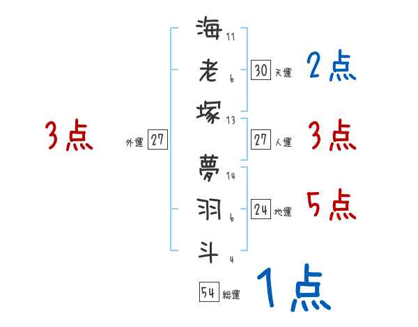 総運![]() | 海老塚夢羽斗さんの総運は54画の1つ星!トラブルが多いかも。周りをよく見て協調して過ごしましょう。 あなたの人生を表す1番重要な運勢です。生涯を通じて影響する総合運となり、主に50歳以降の晩年期に影響を及ぼします。 |